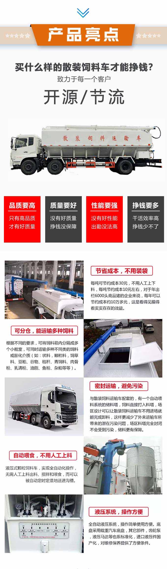 2、散裝飼料在罐體內(nèi)密封輸送,減少損失,保證質(zhì)量,避免污染。全自動上料卸料,可連續(xù)作業(yè),大大提高生產(chǎn)效率。